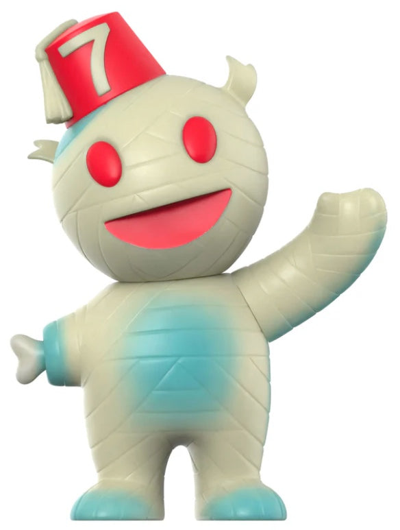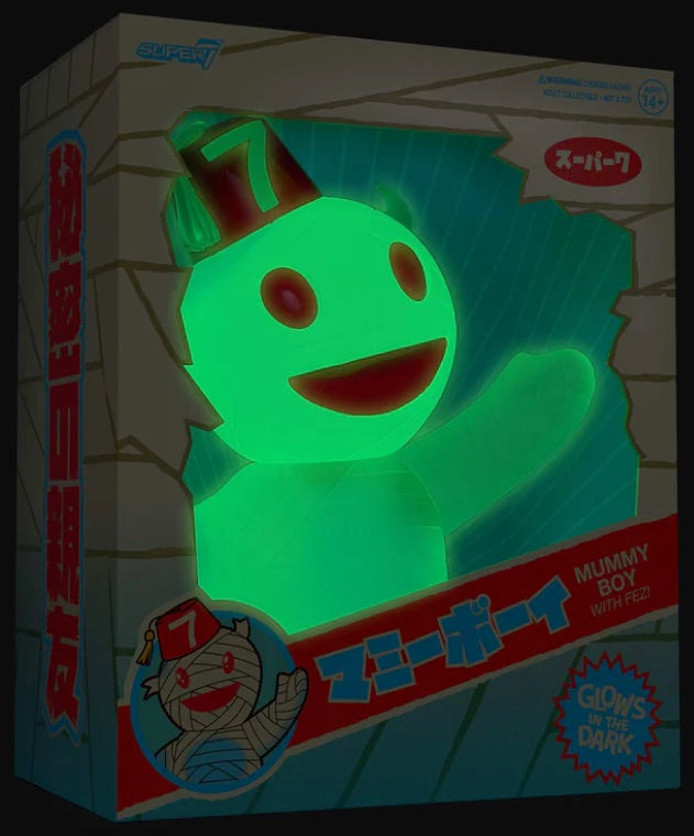 Hats off to Mummy Boy™! Super7’s adorable mascot is stepping up his look with glow-in-the-dark bandages and a brand new fashion accessory - his lucky Super Seven Fez! Inspired by the iconic advertising mascots of the past, Mummy Boy emerges from his tomb to greet everyone with a smile and a wave. Though he may have lost his arm (and his mind) a long time ago, he doesn’t care - he’s just happy to be here. Designed by Super7’s Brian Flynn, this 6” tall, hand-made and hand-painted vinyl is displayed in a deluxe, collector-friendly window box with Japanese lettering. Wrap up your collection with this exclusive Mummy Boy figure.