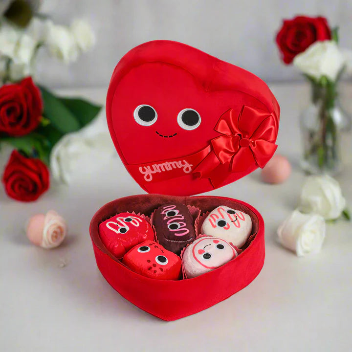Attention, chocolate lovers! Add some variety to your life with Yummy World's Heart Box of Chocolates Interactive Plush! Kidrobot is putting our spin on that classic Valentine's Day gift sure to spread the love year-round. Open the lid of this plush heart-shaped box—complete with a big satin bow—and you’ll find 5 chocolates in different colors, flavors, and styles. Each plush truffle is removable and comes out of its wrapper. Share them with that special someone and sweeten their day!