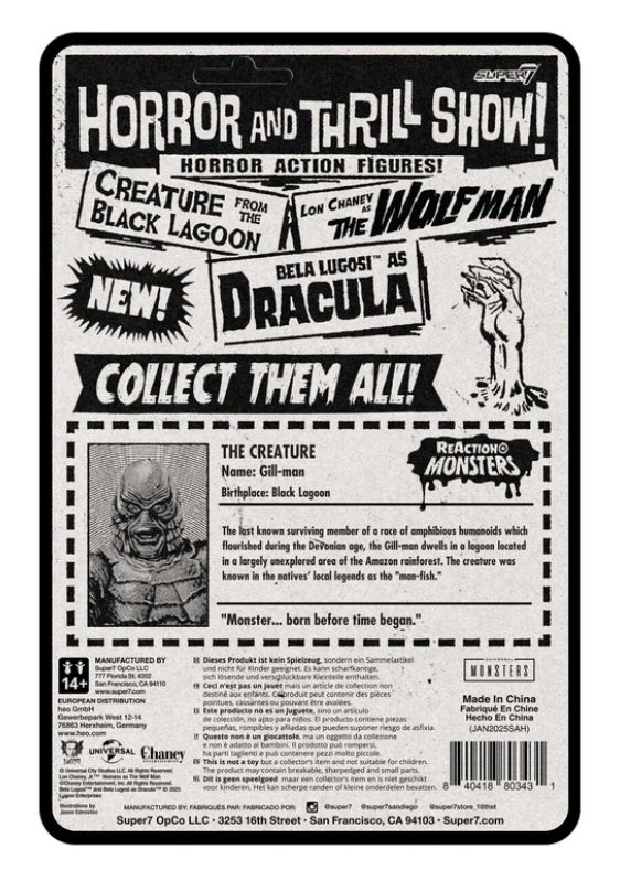 Since it’s always best to swim with a partner, never fear. The Creature from the Black Lagoon will be there by your side, and he’s coming to you straight from the Amazon. Dive in and bring him home as a Universal Monsters Super7 ReAction+ Figure. Inspired by the Gill-man creature from the 1954 film, this 3.75” scale collectible is constructed based on an O-ring design. This collectible has a swivel head and arms, elbow and knee hinges, and disk joint shoulders. And if anyone could get along swimmingly with all your other Universal Monsters ReAction+ Figures, it would be the Creature from the Black Lagoon. Catch him now. He can’t wait to stalk your shelves and display cases.