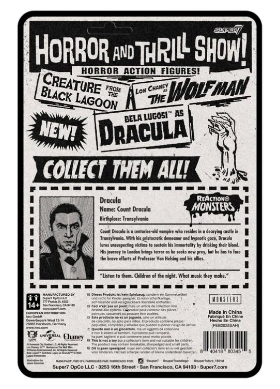 Creep down the winding staircase of a decaying castle in Transylvania, and you might encounter Count Dracula. He can be immortally yours as a hypnotizing Dracula ReAction+ Figure. Inspired by the 1931 film, Dracula, this 3.75” scale action figure is constructed based on an O-ring design. It has a swivel head and arms, elbow and knee hinges, and disk joint shoulders. He even comes with a candelabra accessory! The children of the night are calling, so hurry to keep this Dracula ReAction+ Figure safe in your collection. He might also be eternally grateful if you introduced him to the other members of your Universal Monsters set.