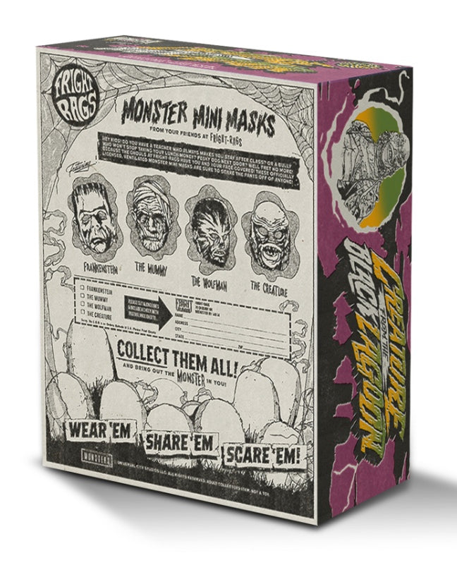 From Fright-Rags. A PREVIEWS Exclusive! The Universe Monsters live! Celebrate the legacy of classic movie monster artist Basil Gogos with these PREVIEWS Exclusive Mini-Masks of The Creature from the Black LagoonFrankenstein, and the Wolf Man! The ventilated latex mask is painted in the artist's signature colorful style and has been shrunk down to half the size, making it easy to collect and perfect for display. Boxed, each mask measures approximately 5.5" W x 6.75" H. Mask is for display purposes and not made to be worn... unless you have a shrunken head!